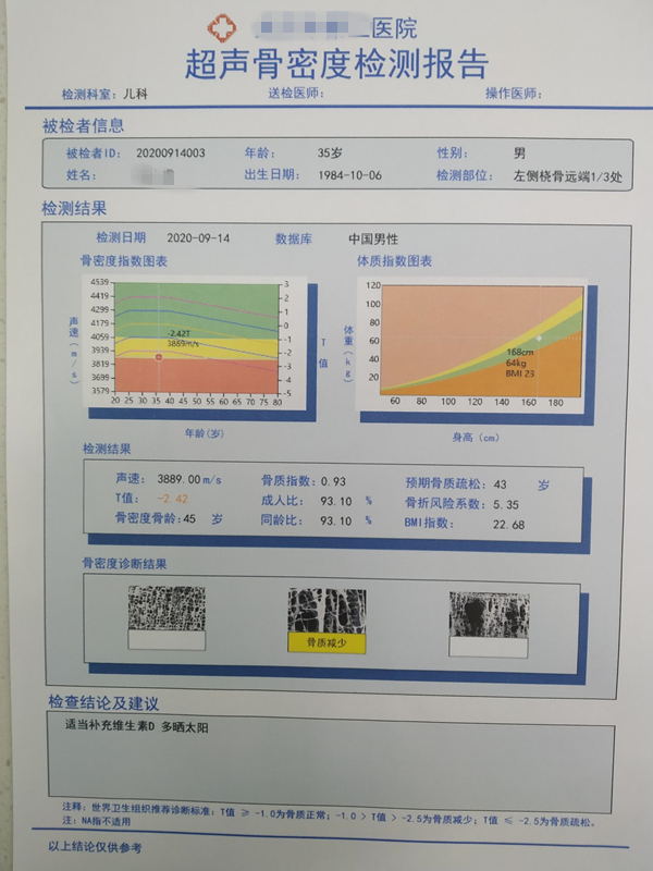 骨密度測(cè)量將提供全身或任意骨的骨密度值,并將測(cè)得的骨密度值與正常人的骨量峰值比較得出T值。