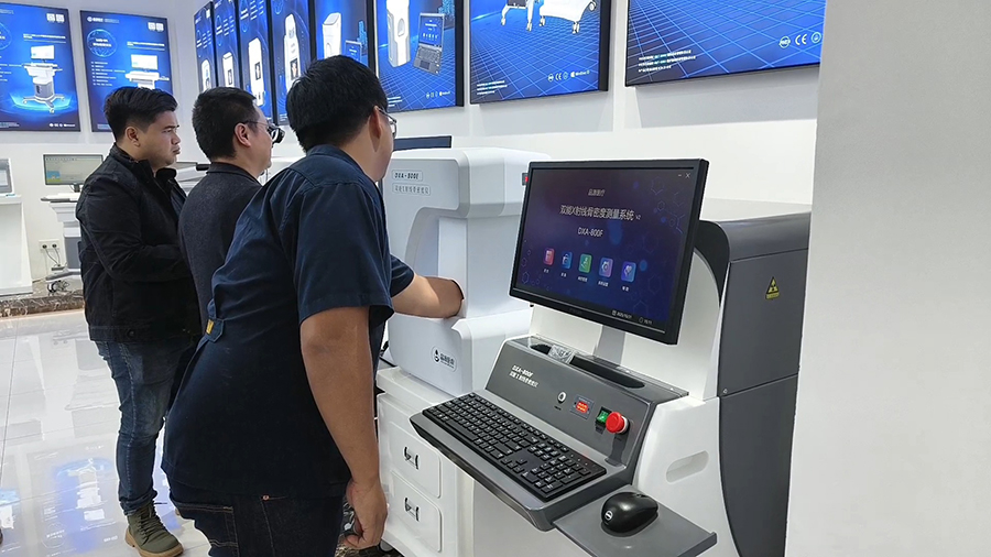 產品體驗環節,在技術人員協助下,客戶代表依次體驗雙能X射線骨密度儀、超聲骨密度儀、動脈硬化檢測儀等產品。客戶代表按指引將前臂放置于檢測區域,雙能X射線骨密度儀作為診斷骨質疏松的“金標準”,利用高低能射線掃描,完成前臂骨密度數據采集,報告以彩色圖譜標注骨密度分布及骨量分級。